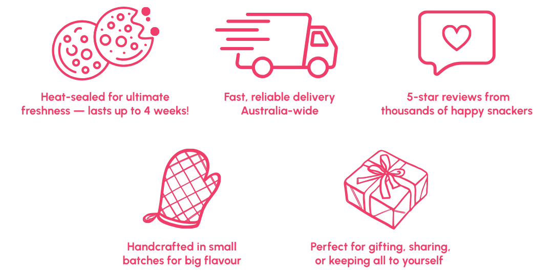 We dispatch quickly via Australia Post so your cookies arrive soft, chunky, and ready to devour. Brisbane locals can also choose pickup (lucky you).